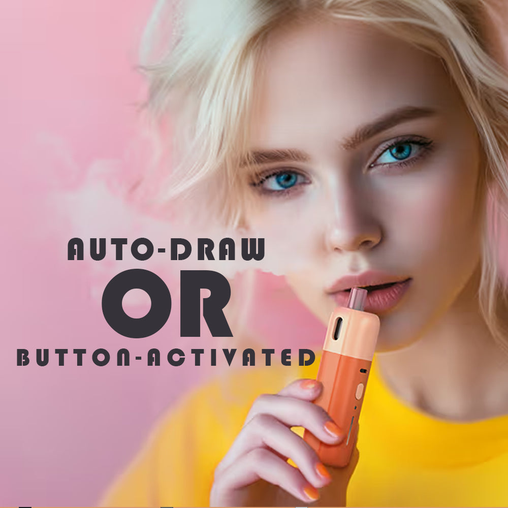 The Fluffi Mini features 2 activation options: auto-draw and button-activated. The auto-draw allows for effortless activation with an inhale, while the button option gives you more control.